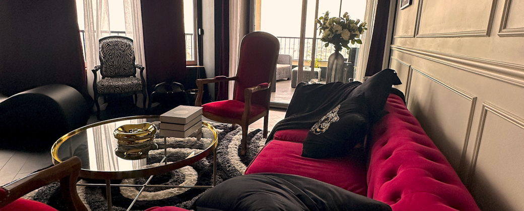 Pensée comme un cocon haut de gamme, la suite associe velours bordeaux, fauteuils Chesterfield, scénographie lumineuse et un miroirs au-dessus du lit.